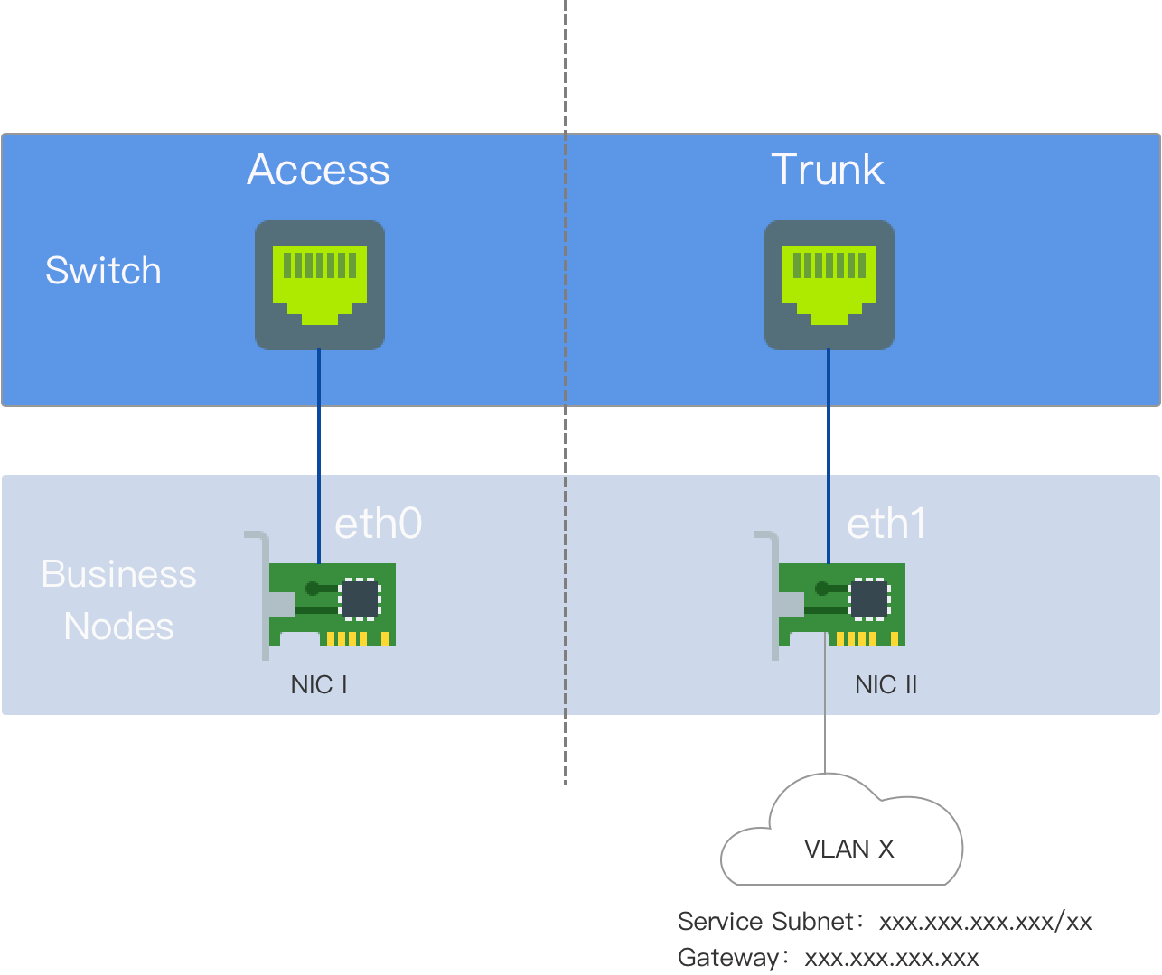 • NIC Two: The NIC without the default route and not configured with an IP address, interconnected with the external switch interface, which is set to Trunk mode. The Underlay subnet exclusively uses NIC Two.